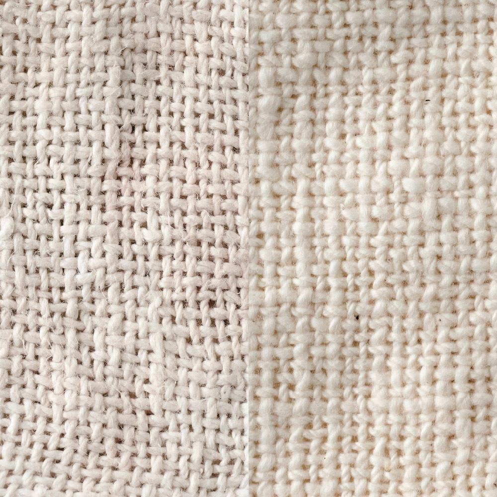 使い始めの和紡布は、ガラ紡糸の綿毛が立ち、ふんわりとした表情がありますが(写真右)、洗顔に使い続けた和紡布は、編み目が締まり、使い始めのふんわり感が落ち着いてきます。(写真左)